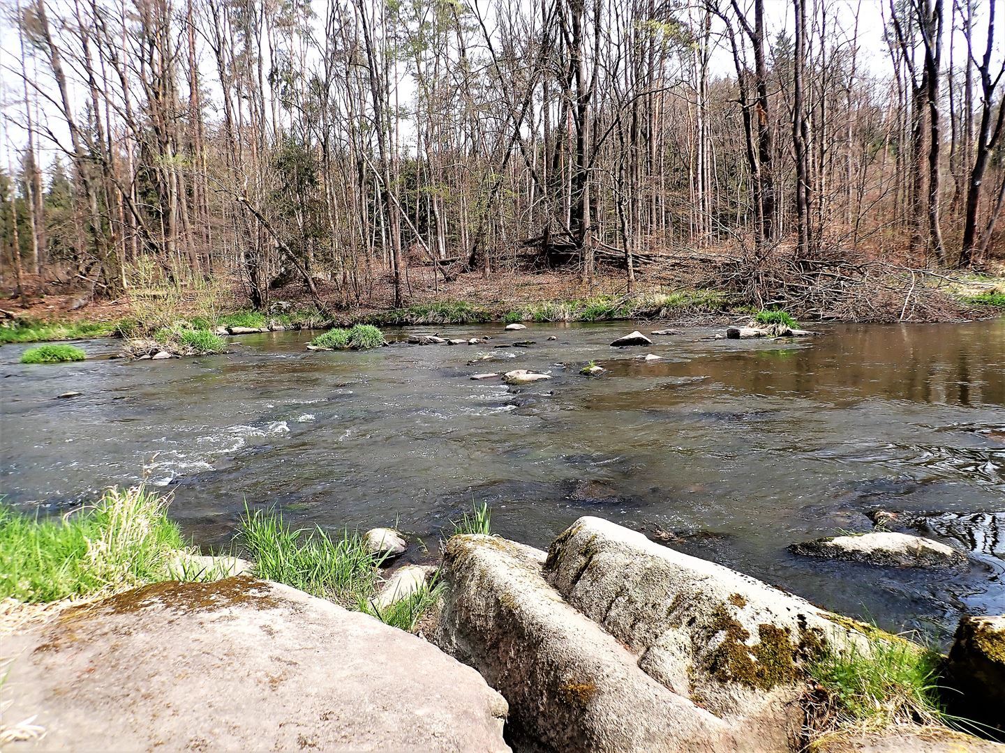 Sázavy pod jezem. Pro všechny, a především pak pro ty mladší, byla vítaným zpestřením vedlejší ohrada s výběhem pro lamy a pštrosy, kteří jsou zvyklí na pozornost lidí a ochotně se nechají krmit zakoupenými granulemi. Z Pelíškova Mostu jsme pokračovali dále podél toku řeky do obce Soběšín, kde se nachází zajímavý silniční most s ocelovou konstrukcí a dřevěným (prkenným) povrchem vozovky. Ze Soběšína vedla trasa kolem osady Tisina přes tok říčky Blanice až k Brtnickému rybníku, kde se u dálnice D1 nachází motorest U Rybiček. Jak již název napovídá, tak rybí speciality zde tvoří podstatnou část jídelního